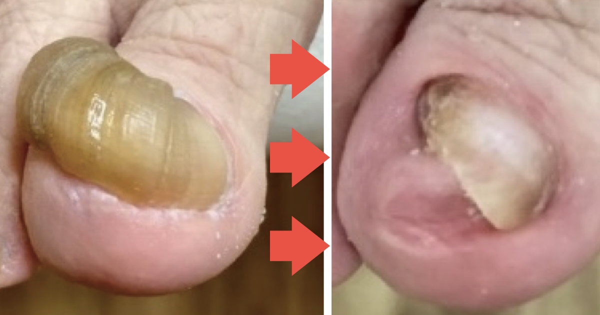 実際にご来院された患者様の爪は、大きく盛り上がりご自身で切るのも難しく、靴に当たって痛みや違和感がある状態でした。