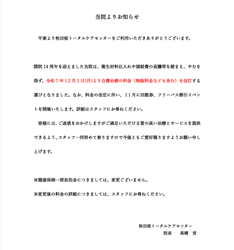 令和7年12月1日より自費施術の料金を改定することになりました。
