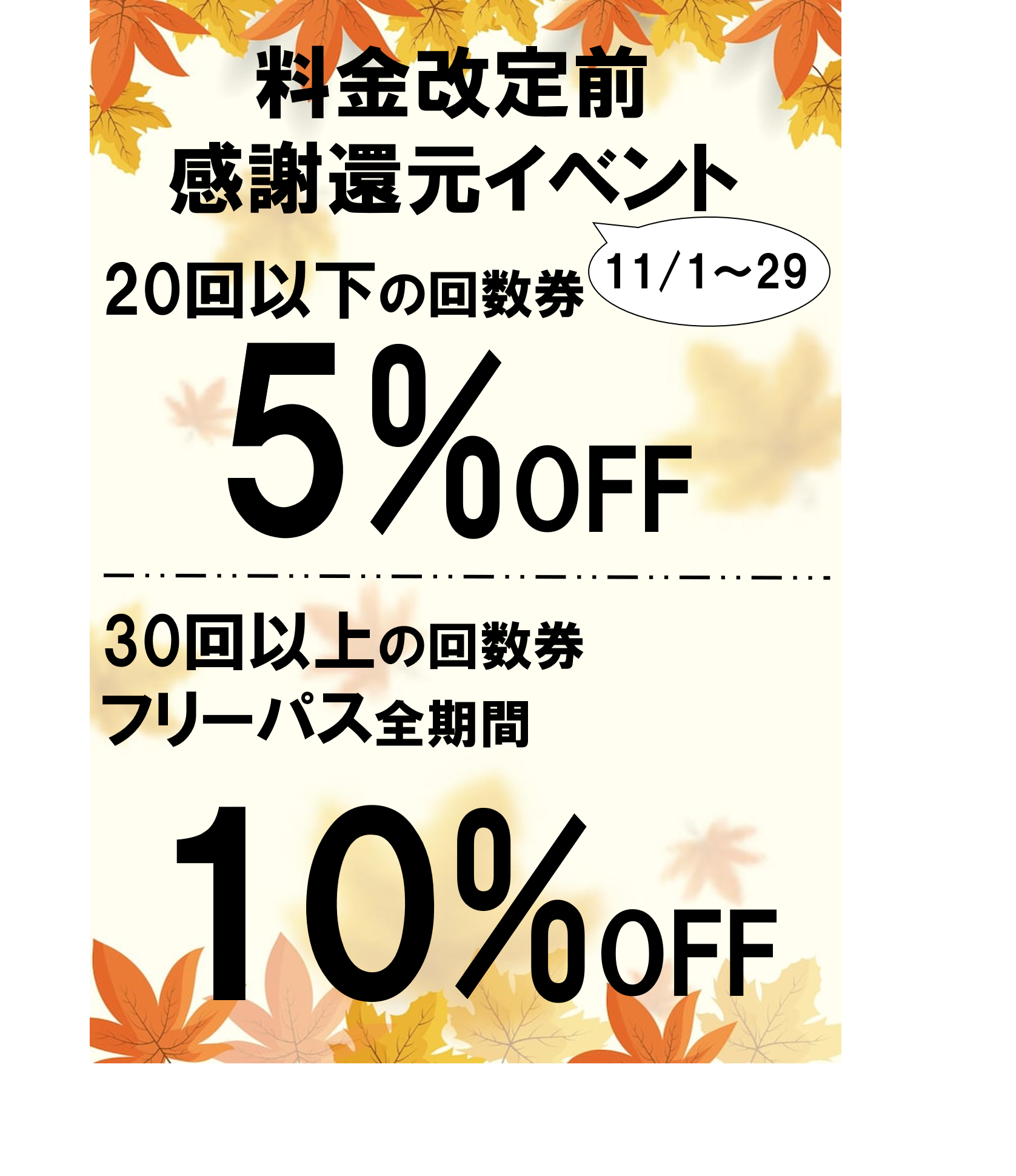 来月に料金改定をするにあたって、今月は回数券とフリーパスの割引イベントを行います!