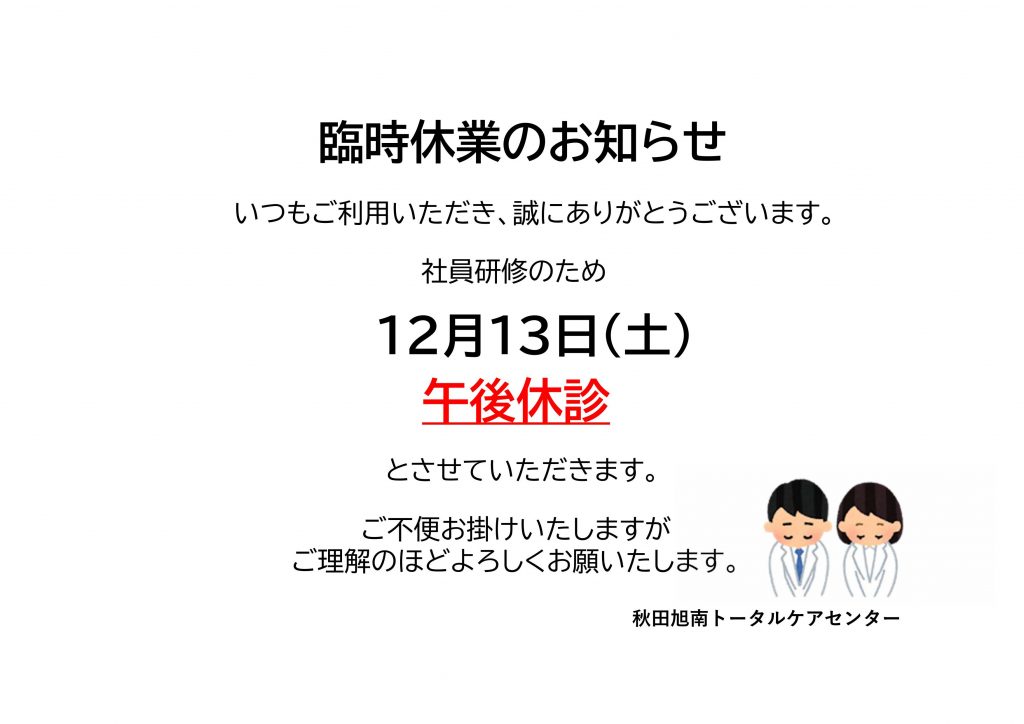今週12月13日㈯は社内研修の為、午後は休診とさせていただきます。