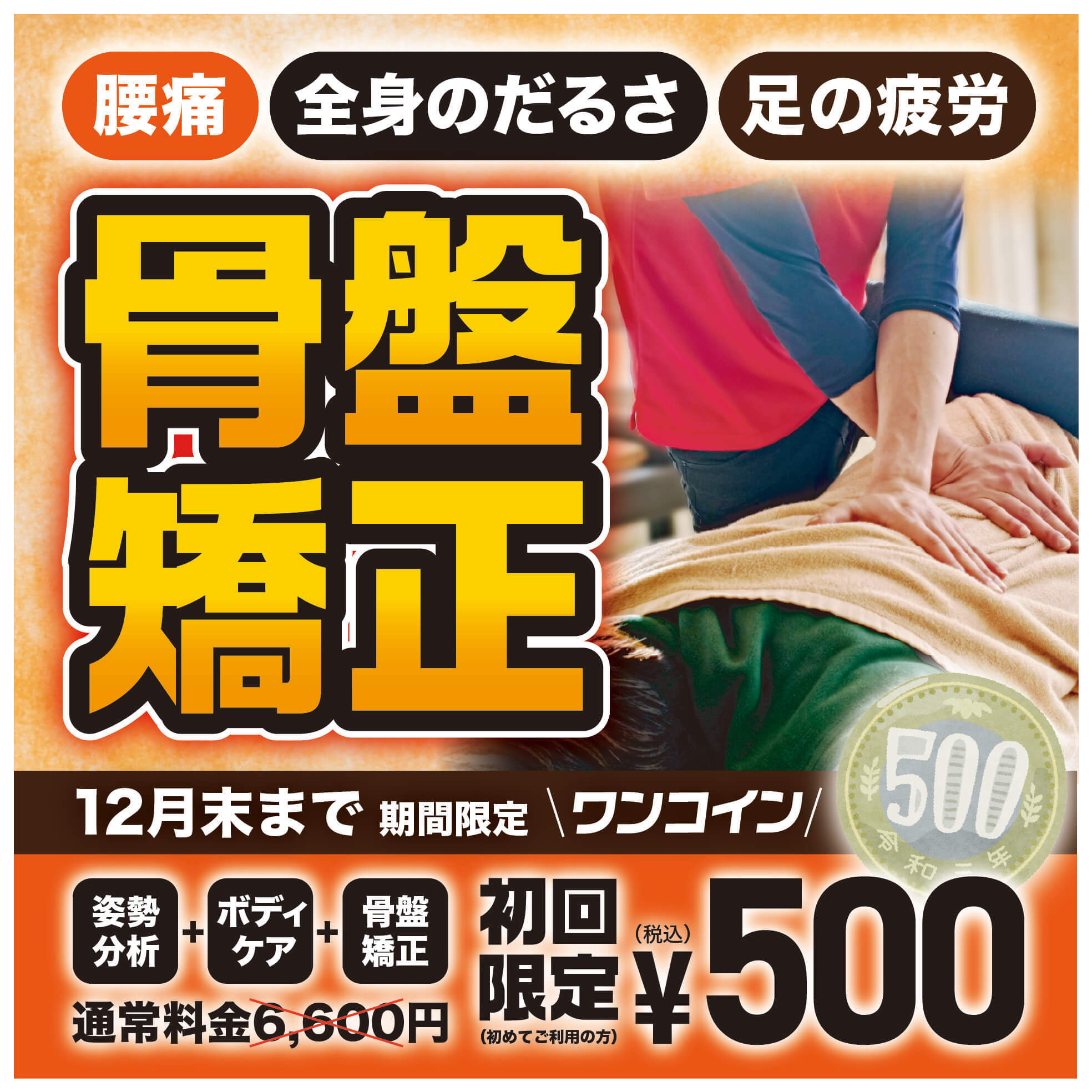 【姿勢分析】+【ボディケア】+【骨盤矯正】が通常6,600円が500円で受けられます!