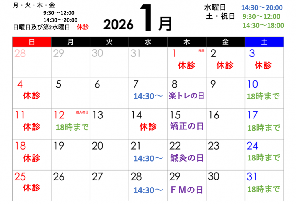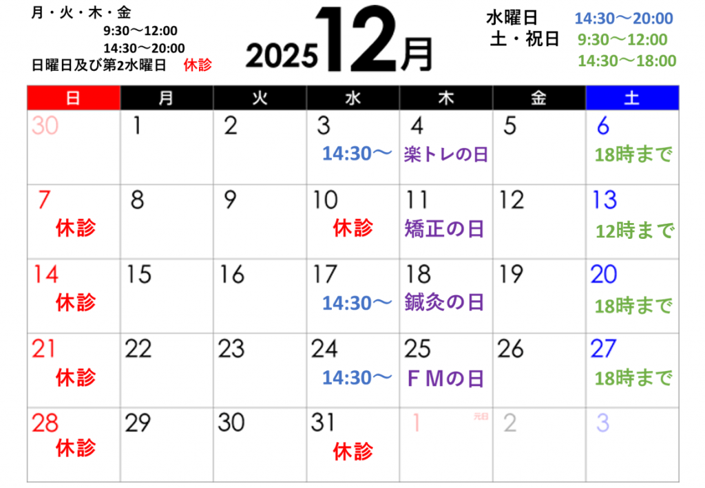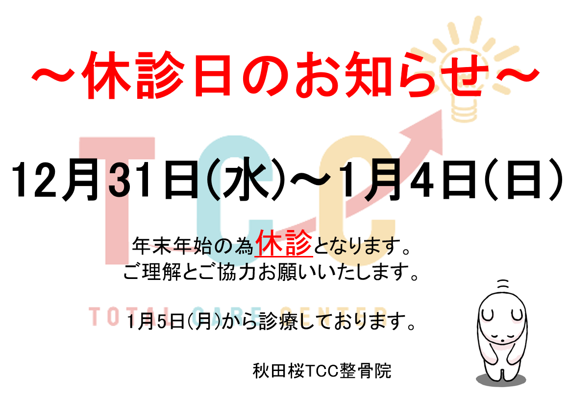 当院は12/31(水)~1/4(日)が休診となりますのでご了承ください。