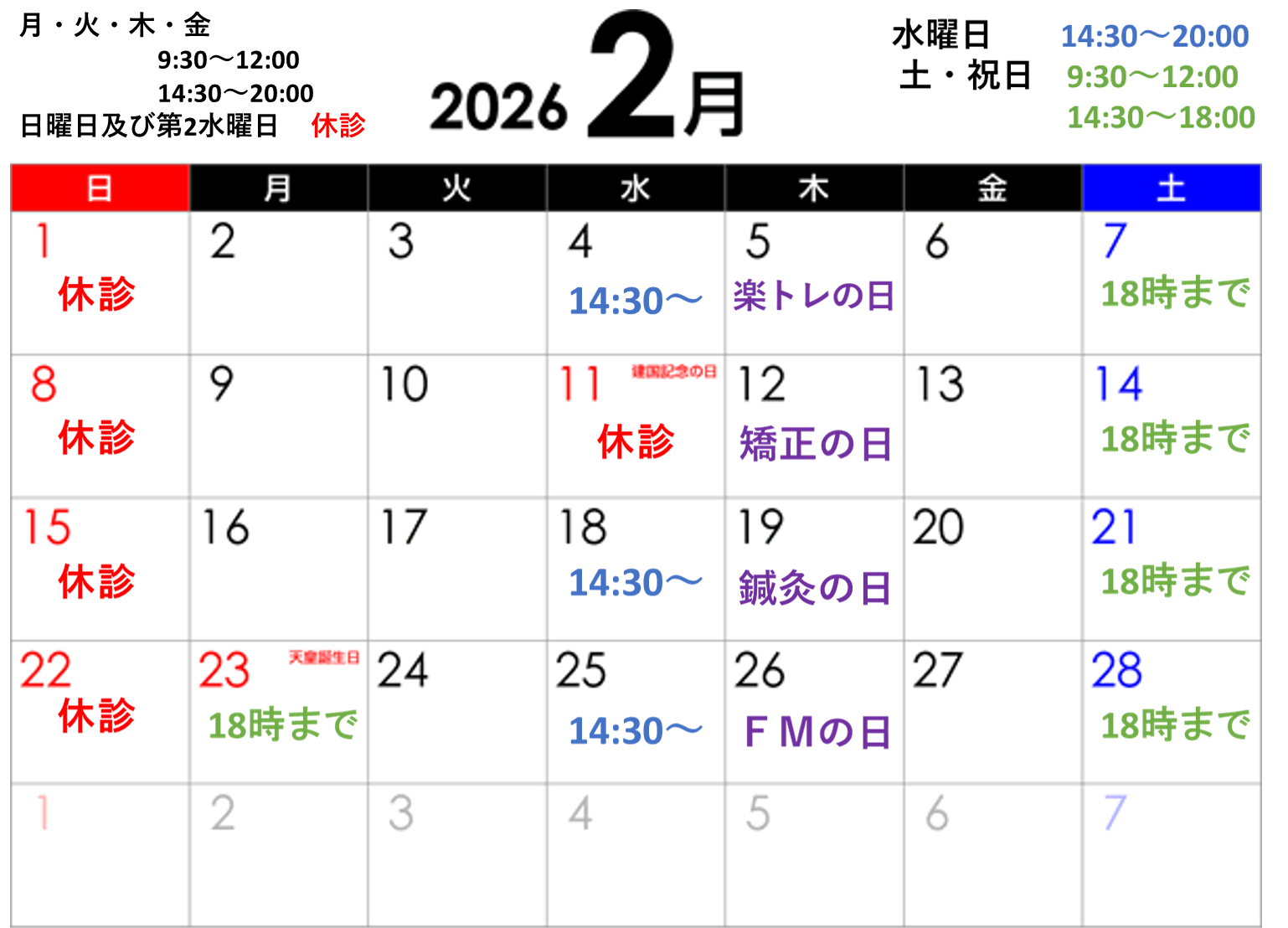 2月も通常通り日曜日、第2水曜休診で診療しております!