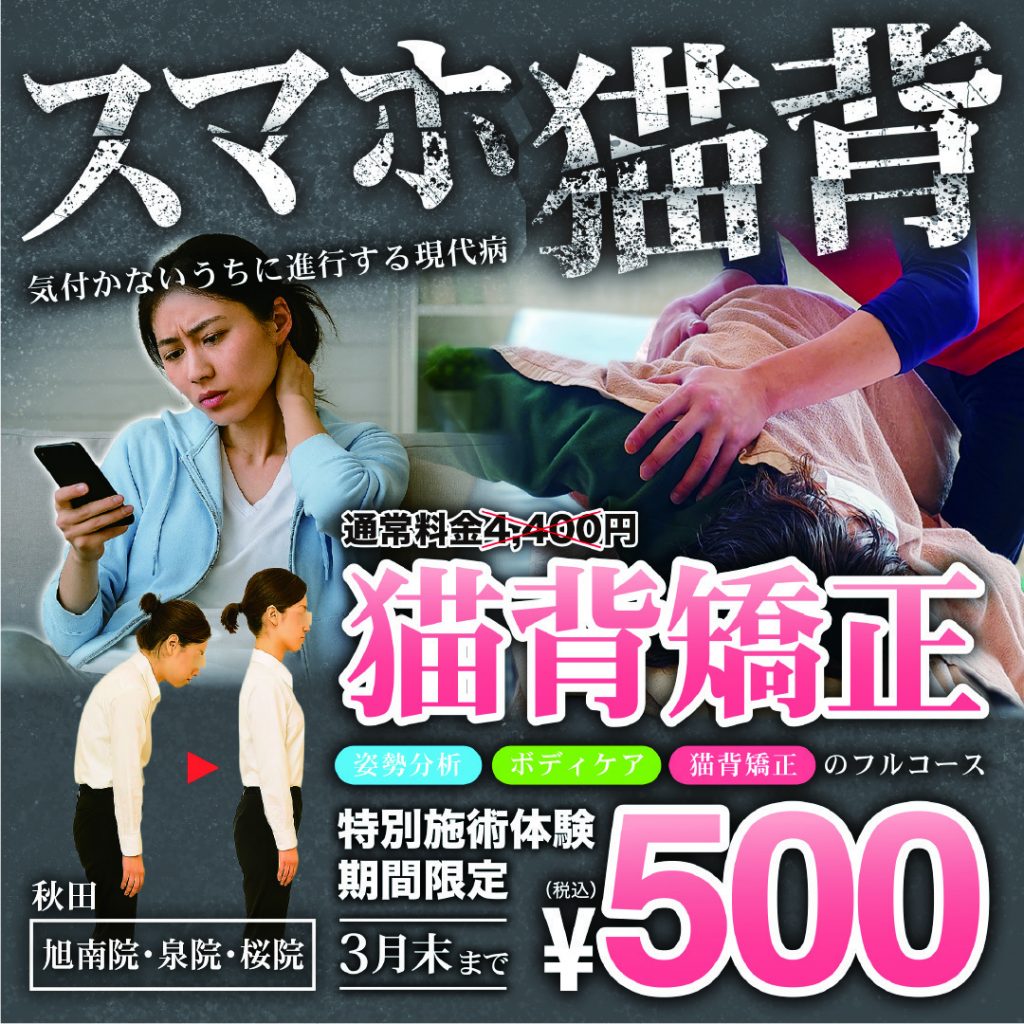 現在キャンペーンにより500円で猫背矯正の体験ができます! 気になる方はぜひお問い合わせください!