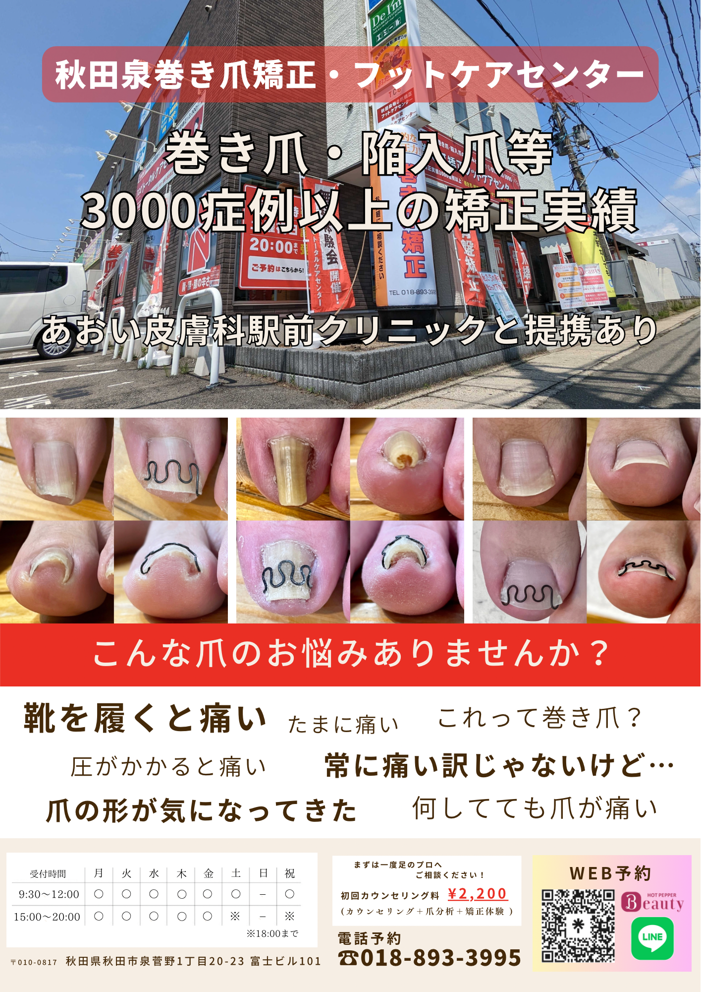こんにちは!秋田県秋田市の私たちTCC、秋田泉巻き爪矯正・フットケアセンターの記事をご覧いただきありがとうございます!