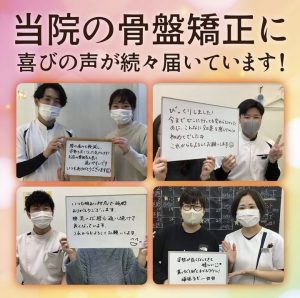 骨盤矯正で伺いました。職業柄、肩こり、腰痛、頭痛に悩まされながら過ごしておりました。時々整体にも通っておりましたが、金額が高くて長く続かず、今回インスタを目にして、物は試しと思い伺いましたが、一回の施術で重い腰が嘘みたいに軽くなりました。次の日出勤でしたが、立ったり座ったりの動作が痛くなかったので、次回伺うのも楽しみです。