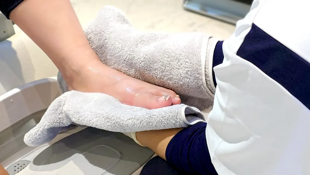 1.足の構造・骨格の調整: 変形した足の関節や、崩れた足のアーチを支える骨格を丁寧に整えます。これにより、親指にかかる不自然な圧力を軽減し、痛みを和らげます。