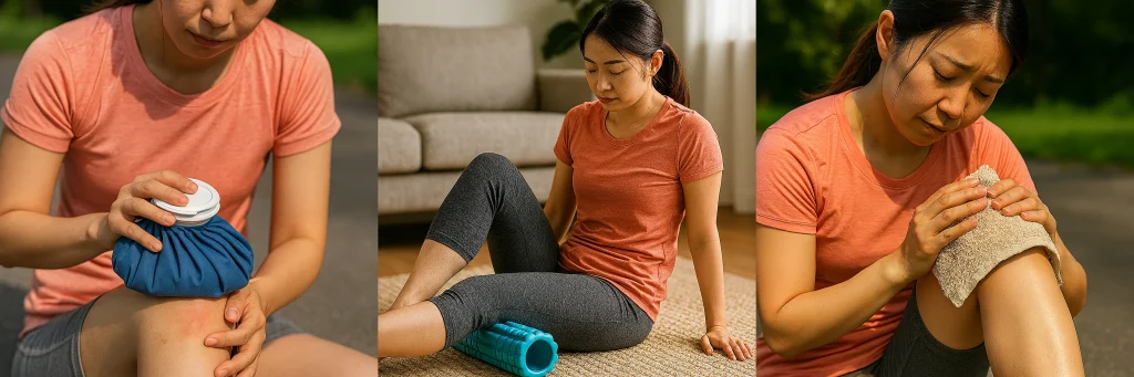 急性期(痛みが強い時) → アイシング(冷却):痛みが強い時、特にランニング後や、痛みが強く出た直後には、患部に炎症が起きている可能性が高いです。この場合、アイシングが最も効果的です。氷嚢や保冷剤を使って、膝の痛む部分を15〜20分ほど冷やしましょう。これにより、炎症を抑え、痛みを和らげることができます。